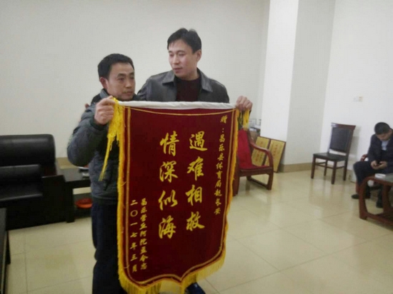 2017年3月8日下午,昌樂市民孟先生在朋友的陪同下,將一面寫有“遇難相救 情深似海”的錦旗送到了昌樂縣競技體育學校副校長趙長安的手里,說是要感謝自己的這位救命恩人。