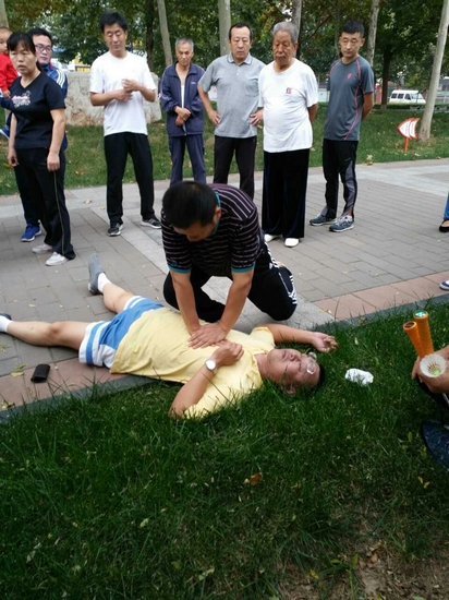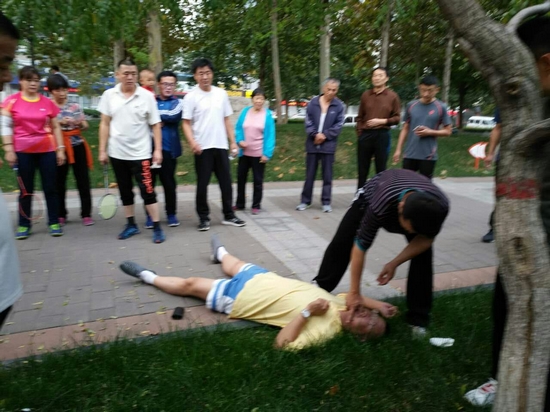 挺身而出 積極施救  2016年9月27日早上6:40時(shí)許,秋日的氣溫已經(jīng)有些偏低。從外地到淄博高青縣工作的閆澤強(qiáng)在蘆湖公園晨練跑步過程中突感身體不適,一下子癱倒在跑道上。旁邊的市民見狀,詢問要不要撥打120救治,閆澤強(qiáng)擺了擺手,并試圖站起來。但是他并未站穩(wěn),就仰面躺在了路邊的草叢中,徹底喪失了意識(shí),隨身攜帶的眼鏡和鑰匙也散落在一邊。看到陌生人暈倒,很多晨練的人就慢慢圍攏了過來,有的市民還想和他對(duì)話,但是沒有任何反應(yīng)。此時(shí),也正在附近晨練打球的高青縣市民陳磊見此情景,也趕緊跑到出事現(xiàn)場(chǎng)。當(dāng)看到圍觀的市民對(duì)患者救治一愁莫展時(shí),出身中醫(yī)世家的陳磊,懂得一些醫(yī)學(xué)救護(hù)常識(shí),看到這突發(fā)情況,判斷患者有可能遭遇到了危重病癥,便立即展開緊急施救。