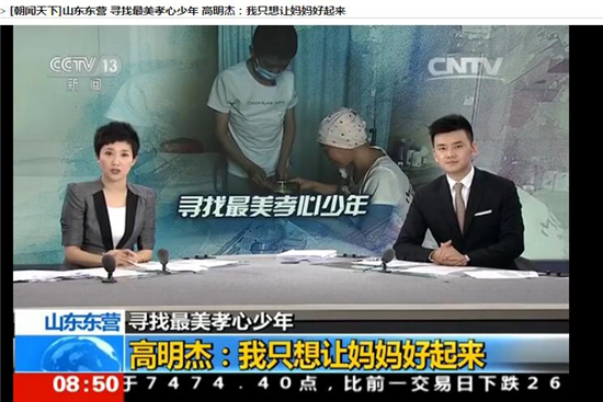 目前,捐獻還算順利。因為需要多次捐獻,高明杰的后背上已經被扎了很多孔。但他用孝心、堅強溫暖了輸向媽媽的血液,溫暖了這個平凡的小家。6月15日,中央電視臺新聞頻道《朝聞天下》欄目以《高明杰:我只想讓媽媽好起來》為題,詳細報道了最美孝心少年高明杰捐獻骨髓救母親的感人事跡。