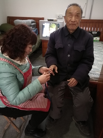 84歲的李光榮老人,生活不能自理,一天到晚總是躺在床上。每天早上,吳本鳳第一件事就是給他端屎端尿,再就是口渴了給他端水,一年四季天天如此,她從來(lái)不嫌不煩。家是高莊的老人張宗和每天早上看到吳本鳳給他倒尿盆,總是過(guò)意不去,積極配合,爭(zhēng)著倒水沖刷痰盂。小吳也總是笑著說(shuō):“沒(méi)事,我就是干這的,我來(lái)吧!”東河北的張?jiān)龈:腿螁⒛罾先硕际菤埣踩耍麄兊哪_都是一只朝前一只朝后,大小便不能自理,吳本鳳總是用手拿著痰盂子給接尿,感動(dòng)的兩位老人逢人就夸并歉意地說(shuō):“我們可是真難為這閨女了。”