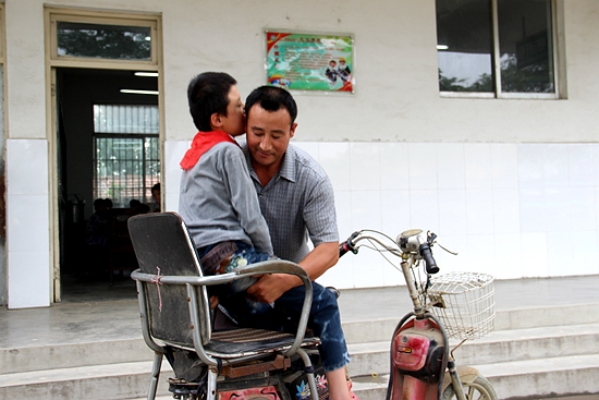 孩子上學(xué)后,師學(xué)武更忙了。每天早晨6點(diǎn),他首先是把12歲的兒子扶起來(lái),幫助穿上衣服,從床上抱到院里的廁所進(jìn)行方便,然后把他放到輪椅上,幫助兒子打水洗漱。一切停當(dāng)后,已是6點(diǎn)半了,這時(shí),老伴已經(jīng)做好了早飯,師學(xué)武把盛好的飯菜端到兒子嘴邊一口一口的喂飯,待兒子吃完后,他隨便的巴拉一點(diǎn)早飯,把兒子從輪椅上抱到電動(dòng)車后座上,為了是兒子坐的舒服安全,他專門給兒子定做了一個(gè)大型的寶寶椅,防止兒子在路上掉下車來(lái)。7點(diǎn)半左右,他們一同趕到了一公里之外的稅郭鎮(zhèn)王堂小學(xué)。到校后,師學(xué)武把兒子從車座上抱到位于教學(xué)樓一樓的二年級(jí)教師內(nèi),安排好兒子后,早晨的第一節(jié)課馬上就要開始了。伴隨著朗朗的讀書聲,坐在兒子旁邊的師學(xué)武緩緩的舒了一口氣,看著兒子聚精會(huì)神的聽課、寫作業(yè),這位已近天命的漢子感覺(jué)到很愜意,很滿足,這也許是他一天當(dāng)中最幸福的時(shí)刻了。