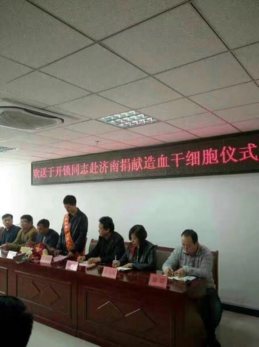 2015年6月19日,在巨野佳和的獻血車上,于開鎖在獻血的過程中了解到骨髓捐獻的相關知識后,又無償捐獻了骨髓造血干細胞血樣,成為了一名光榮的中華骨髓庫志愿者。去年10月份,紅十字會第一次聯系于開鎖,于開鎖與一名四川的白血病患者低分配配型成功。今年年初,在紅十字會的聯系下,于開鎖再次去巨野佳和獻血車上采集血樣,做進一步的高分配配型,造血干細胞配型成功率較低,僅為萬分之一甚至幾十萬分之一,值得慶幸的是,于開鎖和這位患者配型成功,這是于開鎖的榮幸,也是這名患者的榮幸。由于家人對造血干細胞捐獻只是不太了解,害怕捐獻后對身體有不利影響,于開鎖同志一面積極配合調整身體,一面做家庭的工作,征得家人的理解。2017年3月于開鎖去菏澤省立醫院作進一步全身檢查,據于開鎖說,檢查項目很細,尤其是抽血化驗,抽了很多管,比任何一次常規檢查都多。4月5日上午,在巨野縣的衛生和計劃生育局隆重召開歡送會,歡送于開鎖同志赴濟南山東省立醫院捐獻造血干細胞,挽救白血病患者生命。在省立醫院期間,4月6日、7日、8日、9日,每天早晚各一針動員針劑。4月10日早上8點45到中午12點15,于開鎖接受了將近四個小時造血干細胞的采集,捐獻了200毫升造血干細胞。由于對方患者體重較大,200毫升很可能不夠用。4月11日早上9點10分至中午12點35,于開鎖又進行了第二次造血干細胞的捐獻,再次捐獻190毫升的造血干細胞。當天下午四點,在四川,將這批“生命的種子”移植到患者身上。