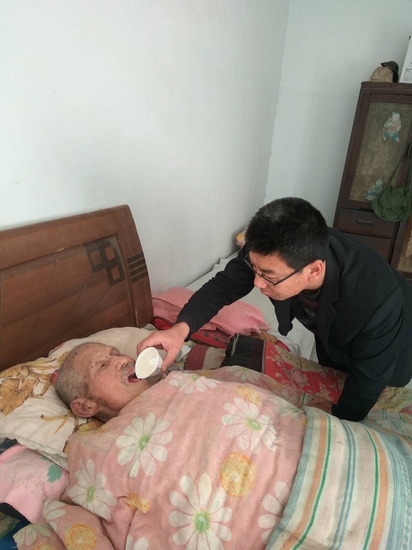 孟老師的爺爺奶奶都是高齡老人,爺爺94歲,奶奶95歲。奶奶年齡雖大,但是自己會動,但爺爺長年臥床,手腳不會動彈,吃喝拉撒全由人照顧。孟老師的父親身體不是很好,照顧兩位老人真是力不從心。孟老師每天放學回家先給爺爺換尿布,再給爺爺喂飯,同時還要照顧奶奶先吃。奶奶脾氣大 ,稍有不適就沖人亂發脾氣。這時孟老師總是微笑著耐著性子,任由奶奶的使喚。爺爺有前列腺炎,小便經常肚子疼,還有時解不下來,這時孟老師細心地給爺爺喂藥并熱敷輔助排尿。爺爺的腿不能動,經常麻木,孟老師上網查閱資料,還請教大夫,給爺爺按摩點穴減輕老人的痛苦。去年,爺爺的前列腺加重不能小便,能用的辦法都用上了也無濟于事,爺爺疼的只叫喚,小肚子憋的硬梆梆的情況很危險。來到醫院后,導尿也沒成功,醫生決定做個手術,在肚子上插導尿管。雖說是小手術,但畢竟老人年紀高,爺爺很害怕。手術期間孟令華全程陪同,他緊握著爺爺的手,盡力安撫老人,但其實自己內心十分害怕,生怕爺也挺不住。手術很快結束了。但放尿液的管子不能始終處于開放狀態,醫生叮囑半個小時才可以開一次,并且這期間老人要多喝水。孟老師一點也不敢怠慢,完全按照醫生的話看護爺爺。麻藥勁一過,刀口有點疼,再加上爺爺年紀高,有各種并發癥,爺爺不停的說胡話,時而清醒,時而迷糊,折騰了一宿。孟老師更是一宿沒合眼。在爺爺住院期間,父親也累病了,于是孟老師白天上班,晚上代替父親值晚班照顧爺爺。出院回家后,照顧爺爺更麻煩了,爺爺的接尿袋每天得消毒,每隔半月還得重新更換導尿管,同時刀口要處理好。孟老師不怕臟,不怕累,用自己的孝心呵護著年邁的爺爺。
