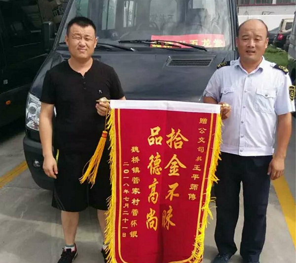 2018年7月23日,菅波先生帶著父母的囑托和真誠的謝意將一面“拾金不昧、品德高尚”的錦旗贈送到王平手中,激動地說到:“11186.1元的現金分文未少,兩萬元的存單還有銀行卡都在,要不是王師傅,這些錢物要是丟了,家里老人得急出病來。”原來,2018年7月22日,菅波先生的父母領著孫子乘坐王平師傅駕駛的公交車,由于天氣炎熱加上外出勞累,孩子上車后不久就睡著了。老人上車后只顧照顧孩子,將裝有身份證、銀行卡、兩萬元存單、一萬多元現金的書包落在了公交座椅上。 回家后兩個多小時老人才發現提包丟了,急的不知所措,趕緊給兒子菅波先生打電話讓兒子去公交公司問一下能否找到。而讓菅先生沒想到的是提包已經被王師傅妥善地交回了公司。