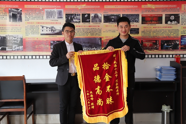 “真是太感謝了。”16日上午,朱海峰手里拿著在合肥定制的錦旗,趕到威海市第十三中學。見到劉宗超老師后,他急步上前握住劉老師的手,激動地說,劉宗超老師真是太善良了,能夠把錢全部還給他,他非常感動。