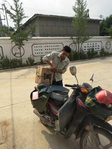 王德建之前在外打工,2013年,他回老家開始當郵遞員,負責坦埠鎮24個行政村的送件工作,每周上7天班,每天騎車六七十公里。他把摩托車收拾得干干凈凈,淺綠色郵包裝滿當天需要派送的郵件。車后的置物箱里疊著一層層塑料袋,是信件的雨衣。2015年一封來自菏澤市張和莊烈士陵園的平信,促成他與為烈士尋親“結緣”。
