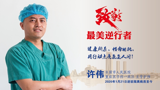 許偉,男,中共黨員,大學本科學歷,有10年急危重癥護理工作經驗,每年連續榮獲市先進個人,院級優秀護士等榮譽稱號,工作勤勤懇懇,任勞任怨,面對這次疫情,第一個提出申請進入前線,同時是第一批進入隔離病房的護理人員,他所在的病房都是接受確診的患者,自疫情爆發以來堅守到現在,在個人和團隊的努力下,已經有13名新冠肺炎患者順利出院。