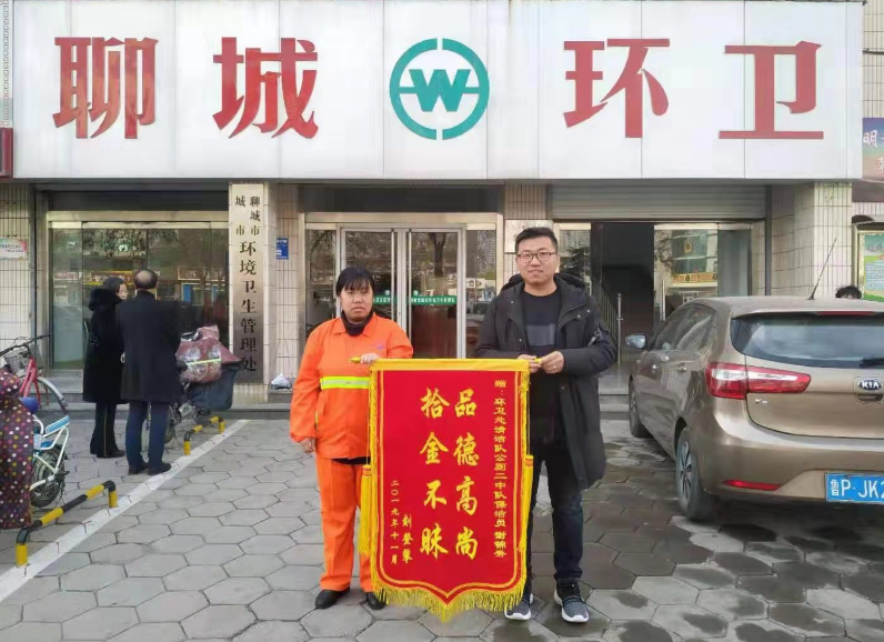 2019年11月27日上午,聊城市民劉登攀先生將一面“拾金不昧 品德高尚”的錦旗交到公廁二中隊隊長王慶元手里,詢問之下,才明白來意,原來是劉先生的母親所丟失的皮包被環衛工人謝錦秀撿到并無償歸還,所以特地訂制了一面錦旗送到單位,以表達他對環衛工人拾金不昧的感謝之情。