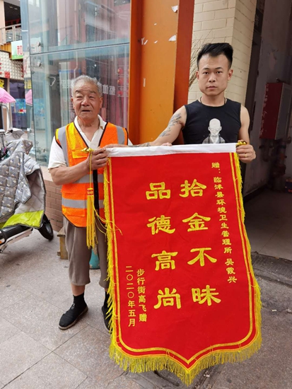 為了表達對吳霞興大爺的謝意,6月11日,失主高先生特意到吳大爺平時工作的地點,將一面錦旗送到他手中,以表達對環衛工人吳大爺深深地敬意。