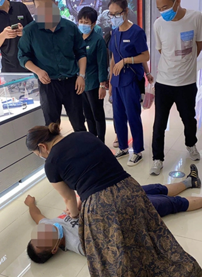2020年9月7日,沈曉玉在淄博市信譽樓商場購物,準備下樓梯往回走時,剛到二樓電梯口,突然聽到“啊”的一聲,隨即看到一名年輕男子,躺在地上,手腳抽搐,職業(yè)的敏感使她意識到男子肯定突發(fā)某種疾病,非常危險。她立即跑過去查看,同時向周圍的人群表明自己醫(yī)務(wù)人員的身份,讓大家不要靠得太近,給患者留出足夠的空間,確保空氣流通。此時躺在地上的男子已停止抽搐,沒有了意識,拍打身體也無反應(yīng),她趕緊觸摸男子的頸動脈,已沒有了搏動。沈曉玉心里“咯噔”一下,“不好,需要立即搶救!”時間就是生命,她迅速為患者清理口鼻腔分泌物,立刻開放氣道為其實施心肺復(fù)蘇,并讓圍觀群眾抓緊時間撥打120 。經(jīng)過兩分多鐘的緊張搶救,硬生生將該男子從死亡線拉了回來,男子心臟終于又開始搏動并有了自主呼吸。
