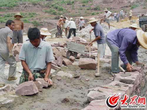 2005年3月16日,工程正式動工。第一天動工就發生了一件令人意想不到的事情。由于山高路遠,駕駛打眼機的工人不小心連人帶車翻到了山路邊的干塘里,人被重重地壓在車底下。雖然人并無大礙,但工人再也不愿干下去了。困難一個個接踵而來。“沙料石料,幾天漲次價,常常需要重新工程預算;趕上麥收農忙,勞動力緊張也頗費腦筋;遇上下雨天,更是擔心得要命,生怕雨水沖毀了壩基、淹了器具。”