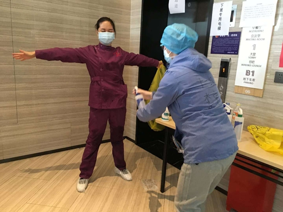 耿艷菲在武漢駐地進入電梯前接受消毒