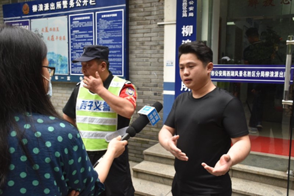 5月20日下午6點許,在西湖景區公園集賢亭附近,某年輕男子突然落水,一位穿著“西子義警”制服大叔,迅速跳入西湖救人。“老家來了兩名朋友,我當時陪他們在西湖乘船,剛在碼頭上岸,就聽見有人喊‘落水了’。”劉揚回憶說,“順著呼喊聲望去,在距離我們大約100多米處,很多人在湖邊圍觀,我知道出事了,就急忙向事發現場跑去。”
