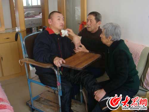 “爸!媽!好!”已經43歲的王群坐在王華堂為他制作的輪椅里,吃力地向二老打著招呼。張翠蘭快步走上前拉起王群的手,想看看他過敏的右手有沒有好轉。“坐!坐!坐!”王群用僅會說的幾個詞讓兩位老人坐到床邊,自己則扭著身子用力地轉動輪椅,向床邊挪去。