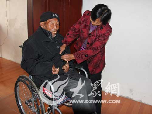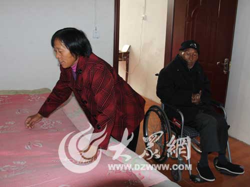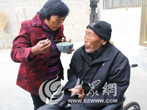由于公公手變形不能動,腳不能走路,都是兒媳婦一手拿飯,一手端湯,一口飯一口湯地喂,一頓飯得一個小時。兒媳李中朵說:“俺爹年齡大了,在床上不能動彈消化不好,俺就盡量給他做合適的吃,還買了豆漿機,天天早上給燒杯熱豆漿喝。只要天好,就把老人抱到門口曬曬太陽,夏天,天天擦身洗澡。”
