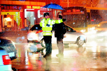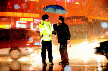 13日晚高峰,歷城交警吳秀磊冒著雨雪在山大北路與洪樓南路路口疏導交通時,一位素不相識的市民,為其撐傘長達20多分鐘。當交警試圖打聽這位好心市民的姓名時,對方很無所謂地說了句,“沒事沒事。”