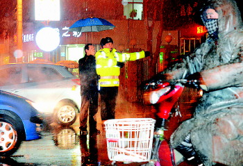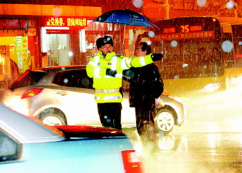 上崗執勤之前,吳秀磊將雨衣帽子戴上,以便蓋住冬常服的警帽,遮擋雨水。開始執勤后,路口交通流量很快便上來了。也不知道是什么時候,吳秀磊雨衣的帽子滑落下來,雨水夾雜著雪花,不斷落在了警帽上。