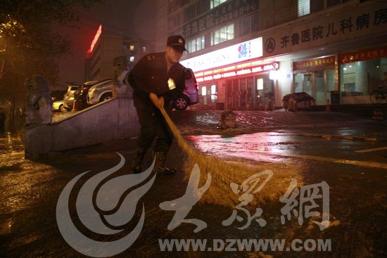 13日晚上10點(diǎn)多,一門衛(wèi)在齊魯醫(yī)院兒科病房門口打掃積雪和積水。記者 張帆 攝