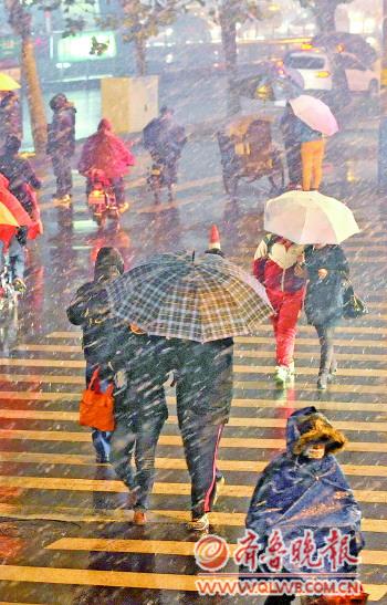 13日入夜時分,省城街頭,片片雪花在風中飛舞,行人冒雪匆匆趕路。13日,濟南市教育部門下發緊急通知,14日中午前后如出現雨雪天氣,學校可自行決定放學時間,也可決定下午是否到校上課,尤其是小學生。記者了解到,13日下午放學時,由于正在降雨,濟南市東方雙語實驗學校東校區破例讓家長進教室接孩子。
