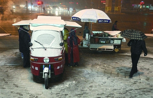 20日晚21時許,省城街頭賣小吃的商販正在雪地里等顧客記者潘炳攝