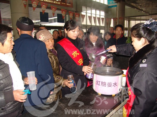 濟(jì)南廣場(chǎng)汽車站工作人員為因雪滯留的旅客贈(zèng)送紅糖姜水。通訊員 朱閣琳 攝