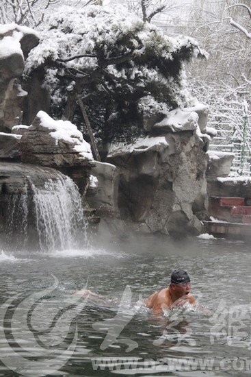 今天上午9點,記者來到了護城河邊上的濟南泉水浴場,五六位冬泳愛好者已經穿上泳衣在池邊做熱身運動。一位常年參加冬泳訓練的王先生告訴記者,在雪天里游泳是件特別“爽”的事兒,在泉水里一點兒都不冷。