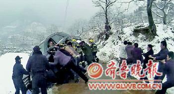 雪多路滑,警車上不去,民警下車步行20余分鐘后到達現場。民警現場看到,一輛車牌號為魯A×××××的黑色奔馳越野車因路滑側翻在山坡處,隨時有墜入深溝的危險。車上兩人被困,都不敢移動,擔心車輛稍微移動會失去平衡墜入深溝。
