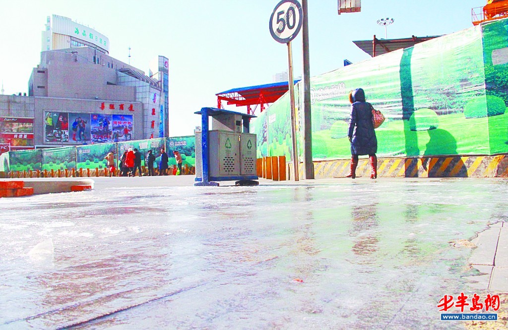 23日,廣西路青島火車站附近,流淌在地上的水很快結(jié)冰。