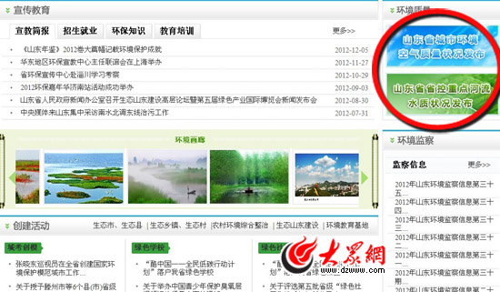 登陸山東省環保廳官網,網友在右側紅圈標注的欄目內可查閱PM2.5等空氣質量數據。