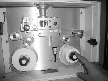 ▲設備里的紙帶上每隔一小時就會打上一個黑點,就能分析出這一個小時里空氣PM2.5的濃度。 (記者 李萌博 攝)