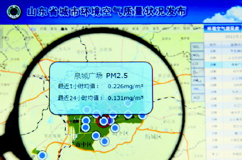 12月20日上午8點半,打開山東環境網站(http://www.sdein.gov.cn/),點擊右下方一個醒目的藍色標志——“山東省城市環境空氣質量狀況發布”,一張山東地圖便浮現在眼前,任意選擇一個城市,放大后即可看到若干不同顏色的圓點,這就是該市的空氣環境監測點位,移動鼠標,即可查閱該監測點最近24小時的AQI(空氣質量指數)、空氣質量等級、出行建議及PM2.5等6項具體指標的實時監測數據。