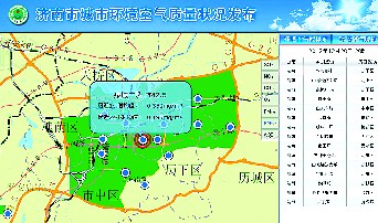 在濟(jì)南市地圖中分布著一些藍(lán)色的圓點(diǎn),它們代表全市15個(gè)空氣質(zhì)量監(jiān)測(cè)點(diǎn)的位置(如圖2)。點(diǎn)擊地圖空白處,滾動(dòng)鼠標(biāo)轉(zhuǎn)輪也可將地圖放大,指向其中一個(gè)點(diǎn)位,會(huì)彈出浮動(dòng)窗口,其中顯示的數(shù)據(jù)可能是“泉城廣場(chǎng),二氧化硫,最近小時(shí)均值和最近24小時(shí)均值”。在這里,讀者容易產(chǎn)生誤解,以為系統(tǒng)只能查到二氧化硫數(shù)值。實(shí)際上,接下來還有別的操作步驟。