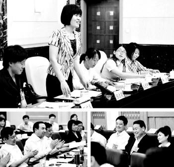 下右圖:臨沂團(tuán)代表在討論中時(shí)聞笑聲。