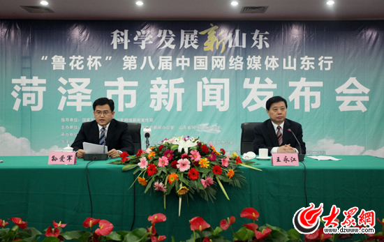 菏澤市委副書記、市長孫愛軍出席科學發(fā)展新山東——“魯花杯”第八屆中國網絡媒體山東行菏澤市新聞發(fā)布會。(盛堃 攝影)