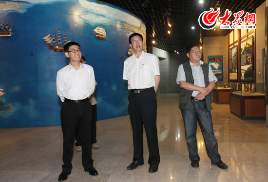 聊城市委常委、宣傳部長趙慶忠(中),大眾報業集團黨委常委、副總編輯郝克遠,大眾網總編輯朱德泉一同參觀中國運河文化博物館。(盛堃 攝影)