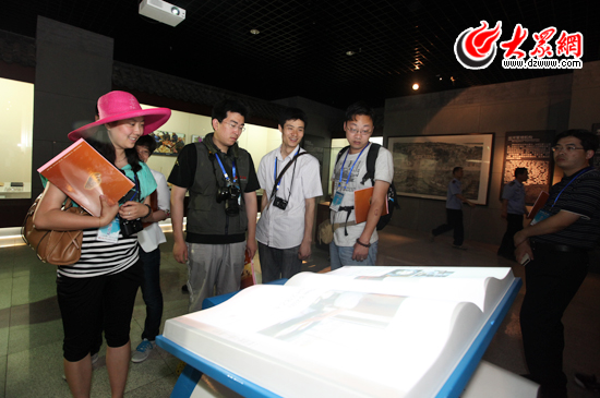 展館內的“電子書”讓采訪團記者更直觀了解聊城市的運河文化。(盛堃 攝影)