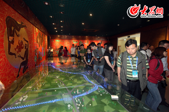 采訪團記者參觀采訪中國阿膠博物館內的阿膠水源模型。(盛堃 攝影)