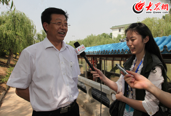 聊城市委常委、宣傳部長趙慶忠接受采訪團記者采訪,并介紹了聊城市在“水城”建設(shè)方面所做的工作。(盛堃 攝影)