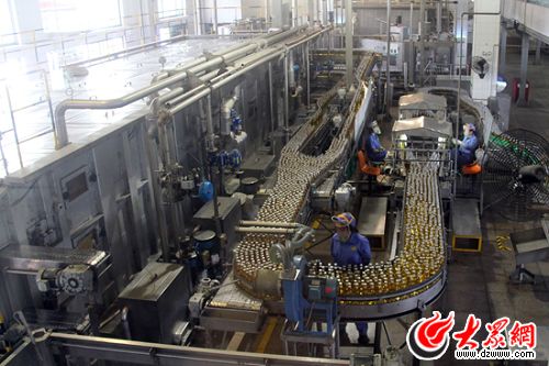 來到青島啤酒老廠時,最先進入視線的就是100字樣的大型銅雕塑,這是2003年青島啤酒百年慶的時候樹立的。在具有國際最先進工藝的車間流水線上的酒瓶就像是夜空里的一串螢火蟲,忙碌的員工穿梭其間,不時地對產品進行抽樣檢查。
