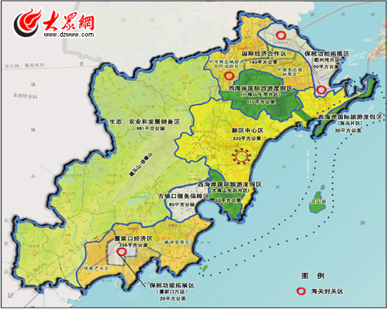 “五區”是五大經濟功能區。一是保稅功能拓展區,規劃建設膠州灣片區、董家口片區兩大保稅功能拓展區;二是國際經濟合作區,規劃建設中德生態園拓展區和中日韓區域經濟合作試驗區;三是董家口經濟區,規劃建設臨港產業區和旅游宜居區,發展石油化工、裝備制造、特種鋼鐵等重化工業,培育海水淡化、海洋新能源產業,建設國家石化產業基地和國家級循環經濟示范區;四是西海岸國際旅游度假區,包括海島片區、大珠山生態片區、小珠山生態片區三部分;五是古鎮口服務保障區,規劃建設船舶保障產業園,發展船舶維修、裝備維修等產業;規劃建設生活服務保障基地,發展商貿、居住、文化、教育、娛樂等配套服務業。