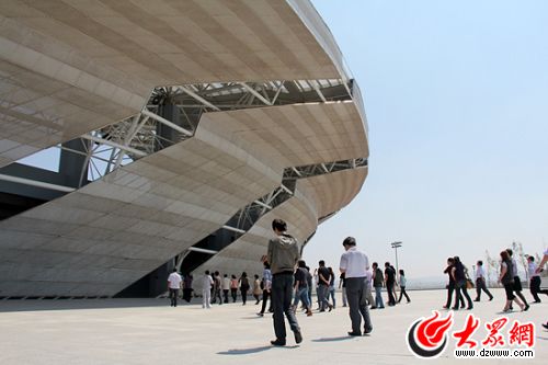 在離文登市體育公園還有幾百米的時候,記者們就對著前方的銀白色圓形建筑物發出感嘆:“快看!那個建筑真漂亮!”文登市城鄉建設局的孫丹丹笑著告訴大家,這座建筑就是文登市體育公園,而它的設計單位就是奧運場館“鳥巢”的中方設計單位——中國建筑設計院設計的。