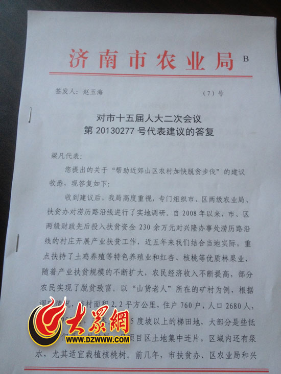 大眾網記者注意到,這份《答復》材料中還寫道:“市農業局、市扶貧辦將進一步加大對市中區尤其是澇歷路沿線村莊的扶貧支持力度,幫助貧困村民發展致富產業、項目,夯實脫貧致富的產業基礎,力求從根本上實現脫貧。”