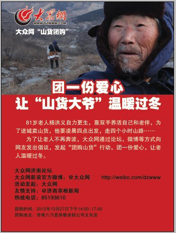 就在7天前,大眾網(wǎng)記者跟隨81歲的楊洪義老人同走40里山路進(jìn)城賣(mài)貨,為了讓老人不再翻山越嶺,溫暖過(guò)冬,大眾網(wǎng)發(fā)起此次“團(tuán)購(gòu)山貨”活動(dòng)。(大眾網(wǎng)稍后將帶來(lái)詳細(xì)報(bào)道)