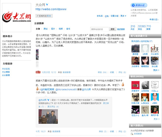 大眾網濟南12月27日訊(記者 劉欣)55條原創微博、300余條微博評論、600余次微博轉發……這些數字是大眾網友們愛心的見證!今天,大眾網官方微博@大眾網 對愛心“團購山貨”活動進行了全程微博直播,近100位網友通過微博號召大家購買愛心山貨,傳遞網絡正能量。