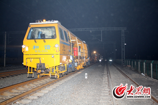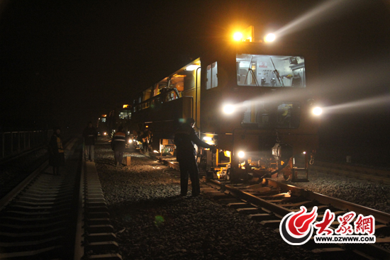 [提要] 1月13日晚上8點28分,淄博市臨淄火車站前,漆黑、安靜。大眾網記者跟隨濟南鐵路局工務機械段的20多名維修工走上月臺。此時,鐵軌上,一組50多米長的維修機車正靜臥在膠濟鐵路客運專線上,等待我們的到來。