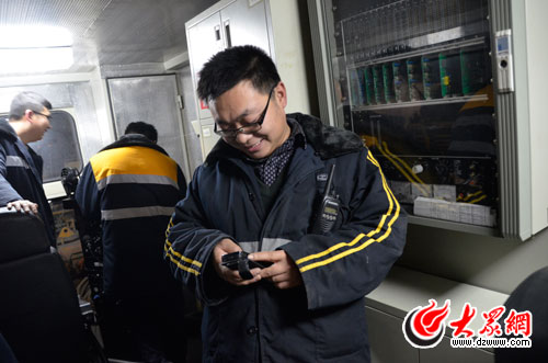 此時,搗固車副車長魏汝坤下車查看維修情況。由于正車長回家結婚,因此,他在行使正車長的職能。小魏20歲司機學校畢業(yè),一干就是8年,看著我們凍得直跺腳,他把我們拉到車上工作間笑著告訴我們:“今天最冷才零下6度,不太冷,施工點離車站只有一公里,這是我們最幸福的一夜了。前幾天在青島野外,零下十多度,臉都凍僵了……”
