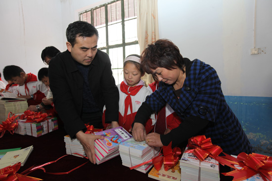 大眾網副總編輯姜長勇向明德小學學生捐贈愛心書籍。(曹亮 攝)