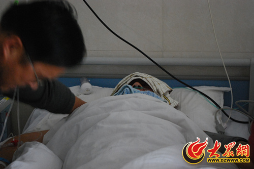 龔鈺犇躺在北邊的病床上,全身都蓋著被子,頭上敷著毛巾,露出的左腳裹著厚厚的紗布。病床邊掛著八九袋點滴,鼻子里還插著氧氣管。他已經清醒,嘴里咬著毛巾,仍時不時的發出疼痛的呻吟聲。