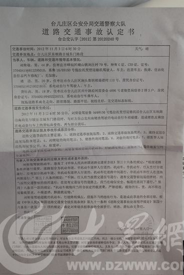 大眾網11月25日訊(記者 張帆 劉國棟)今天上午,記者輾轉聯系到負責龔鈺犇交通事故的臺兒莊區公安分局交通警察大隊事故處理中隊中隊長李玉龍,并且看到了道路交通事故認定書。目前,肇事車輛的駕駛員劉某已經被逮捕,下一步公安機關將向法院、檢察院提請刑事附帶民事的公訴。