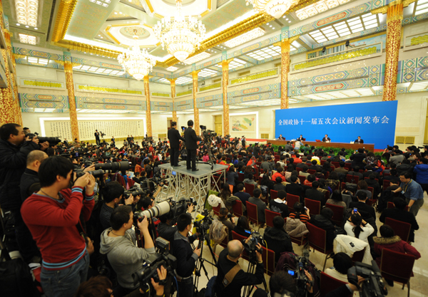2012年3月2日15時,全國政協十一屆五次會議新聞發布會在人民大會堂三樓金色大廳召開,大會新聞發言人趙啟正向中外媒體介紹本次大會有關情況,并回答記者提問。圖為新聞發布會現場。王翰林 攝